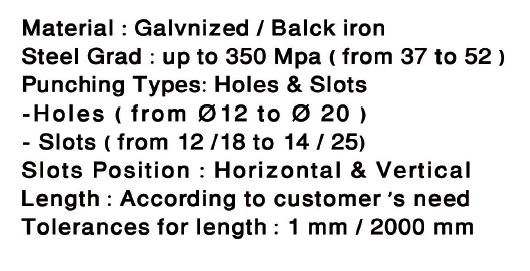 وتبدأ من سمك 1.5مم حتى 4مم ويمكن انتاج اطوال حتى 12م ويمكن عمل التخريم المطلوب ( تخريم دائري - تخريم slot ) طبقا اللوحات الهندسية.