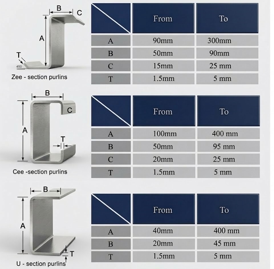 عبارة عن قطاعات حديدية من صاج أسود او صاج مجلفن خفيفة الوزن عالية المقاومة للأحمال والاجهادات بأشكال c-u-z بكافة الدرجات والصلابات المطلوبة وهي مصنعه بواسطة أحدث خطوط الدرفلة على البارد.
